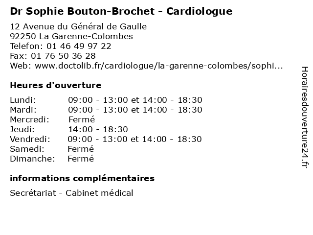 1 Dr Stéphane Gaucher - Cardiologue (Distance: 0,00 km) 12 Avenue du Général de Gaulle, 92250 La Garenne-Colombes cardio, cardiologie, cardiologue, coeur, dr, gaucher, stéphane 2 Dr Fadila Bounar Cardiologue - secrétariat (Distance: 1,91 km) 147 Boulevard Charles de Gaulle, 92700 Colombes bounar, cardiologue, consultation, docteur, dr, fadila, med, médecin, médecine, secrétariat, traitement 3 Dr Fadila Bounar - Cardiologue - secretariat (Distance: 1,91 km) 147 Boulevard Charles de Gaulle, 92700 Colombes bounar, cardiologue, dr, fadila, médecin, médecine, médical, pharmaceutique, secretariat, traitement 4 Dr Benoît Gerardin - Cardiologue (Distance: 2,57 km) 36 Boulevard du Général Leclerc, 92200 Neuilly-sur-Seine benoît, cardiologue, dr, gerardin, médecins, médicaments, santé, secrétariat, spécialiste 5 Dr Catherine Ardouin - Cardiologue (Distance: 2,63 km) 87 Rue des Mourinoux, 92600 Asnières-sur-Seine ardouin, cardiologue, catherine, dr, médecin, médecine, médical, pharmaceutique, traitement 6 Dr Toufik Bouzaouza - Cardiologue - secrétariat (Distance: 3,52 km) 2 Rue du Docteur Rouques, 95870 Bezons bouzaouza, cardiologue, consultation, docteur, dr, med, médecin, médecine, secrétariat, toufik, traitement |