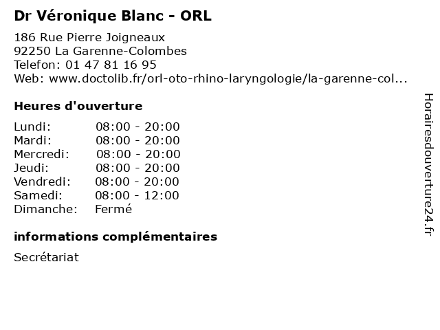1 Dr Véronique Blanc - ORL (Distance: 4,85 km) 18 Rue Maurice Thorez, 92000 Nanterre blanc, dr, imagerie, médicale, orl, radiologie, radiologue, véronique 2 Dr Véronique Pellereau - Médecin généraliste - secretariat (Distance: 0,43 km) 25 Rue des Vallées, 92700 Colombes dr, généraliste, médecin, médecine, médical, pellereau, pharmaceutique, secretariat, traitement, véronique 4 Dr Véronique Collot - Radiologue (Distance: 1,15 km) 30 Rue Kilford, 92400 Courbevoie collot, dr, médecins, médicaments, radiologue, santé, secrétariat, spécialiste, véronique 5 Dr Ali Bougara - Oto-Rhino-Laryngologiste (ORL) (Distance: 1,15 km) 56 Rue du Maréchal Joffre, 92700 Colombes ali, bougara, docteur, dr, laryngologiste, médecin, médical, orl, oto, rhino, santé, soins 6 Dr Christian Chappey - ORL (Distance: 1,15 km) 56 Rue du Maréchal Joffre, 92700 Colombes chappey, christian, consultation, docteur, dr, med, médecin, médecine, orl, traitement |