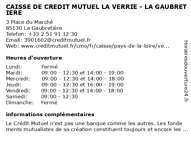 Termes de recherche pour CAISSE DE CREDIT MUTUEL LA VERRIE - LA GAUBRETIERE:la, de, crédit, mutuel, caisse, gaubretière, verrie |