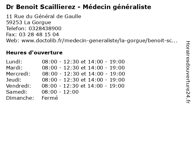 | Mercredi | 08:00-12:30 et 14:00-19:00 |