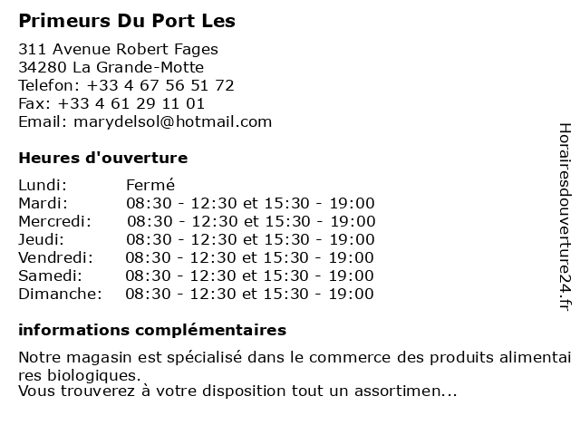 1 Poissonnerie du Port (Distance: 0,30 km) 1 Avenue robert fages, 34280 La grande motte du, la grande motte, poissonnerie, port 2 Nespresso (Librairie du Port) (Distance: 0,44 km) 116 Rue du Port, 34280 La Grande-Motte accessories, coffee, du, librairie, machines, nespresso, points de recyclage, port, services 3 Pharmacie De Port Camargue (Distance: 6,11 km) 8 avenue Jean Lasserre, 30240 Le Grau du Roi camargue, de, homéopathie, médicaments, orthopédie, parapharmacie, pharmacie, port 4 Cerda Primeurs Epicerie Fine Et Produits Frais (Distance: 8,54 km) Portette 64 Rue De La, 34130 Mauguio cerda, epicerie, fine, frais, fruits, légumes, magasins, primeurs, produits 5 École Primaire Publique Port Ariane (Distance: 14,15 km) 85 Rue Alberti, 34970 Lattes ariane, cours, education, port, primaire, publique, services, école 6 Pharmacie Port Ariane (Distance: 14,42 km) 1047 Avenue Léonard de Vinci, 34970 Lattes ariane, conseil, médicaments, pharmacie, port, santé, soin |