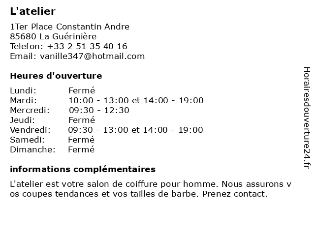 4 L Atelier Du Boulanger (Distance: 11,13 km) Camping Campeole, 85550 La Barre De Monts atelier, boulanger, boulangeries, détail 5 L'Atelier de Fanette (Distance: 15,44 km) 4 grande Rue, 85230 Beauvoir-sur-Mer balayage, coiffeur, coiffure, coloration, coupe, de, fanette, l'atelier, mèches 6 |