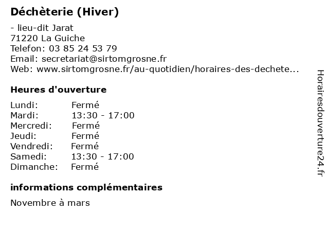 1 Déchèterie (Hiver) (Distance: 11,56 km) - lieu-dit Prés Bouin, 71250 Salornay-Sur-Guye bennes, débarras, déchèterie, détritus, hiver, ordures 2 Déchèterie (Hiver) (Distance: 17,92 km) - route départementale 207, 71460 Malay bennes, débarras, déchèterie, détritus, hiver, ordures 3 Déchèterie (Été) (Distance: 0,00 km) - lieu-dit Jarat, 71220 La Guiche bennes, débarras, déchèterie, détritus, ordures, été 4 Déchèterie (Été) (Distance: 11,56 km) - lieu-dit Prés Bouin, 71250 Salornay-Sur-Guye bennes, débarras, déchèterie, détritus, ordures, été 5 Déchèterie (Distance: 13,24 km) - route départementale 60, 71420 Ciry-le-Noble bennes, débarras, déchèterie, détritus, ordures 6 Déchèterie (Été) (Distance: 17,92 km) - route départementale 207, 71460 Malay bennes, débarras, déchèterie, détritus, ordures, été |