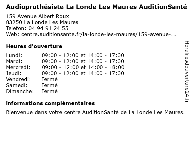 1 Audioprothésiste Hyères - VivaSon (Distance: 8,74 km) 20 Avenue Gambetta, 83400 Hyères audioprothésiste, hyères, vivason 2 Amplifon Audioprothésiste Hyères (Distance: 8,77 km) 12 Avenue Des Iles D'or, 83400 Hyères amplifon, audiologie, audioprothésiste, hyères 3 Audika - Audioprothésiste Hyères (Distance: 8,80 km) 12 Rue du Soldat Bellon Antoine, 83400 Hyères appareil auditif, audika, audiologiste, audioprothésiste, centre auditif, hyères, spécialiste audition 4 Audioprothésiste Hyères Audition Santé (Distance: 8,81 km) 4 Avenue Ernest Millet, 83400 Hyères audiologie, audioprothésiste, audition, hyères, santé 5 Audika - Audioprothésiste Le Lavandou (Distance: 10,75 km) 34 Rue de la Rigourette, 83980 Le Lavandou appareil auditif, audika, audiologiste, audioprothésiste, centre auditif, lavandou, le, spécialiste audition 6 Audioprothésiste La Crau AuditionSanté (Distance: 12,97 km) 14 Boulevard De La République, 83260 La Crau audiologie, audioprothésiste, auditionsanté, crau, la |