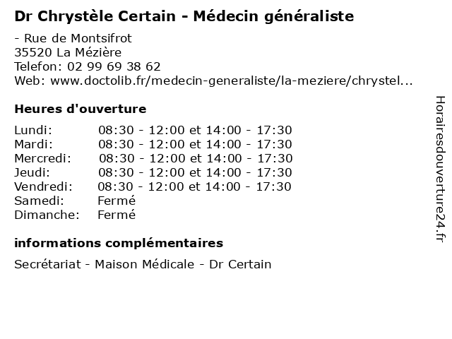 | Lundi | 08:30-12:00 et 14:00-17:30 |