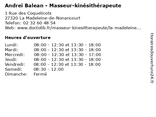 | Jeudi | 08:00-12:30 et 13:30-18:00 |