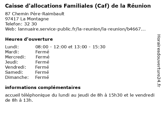 1 Caisse d'Allocations Familiales (CAF) de La Réunion (Distance: 5,24 km) 127 route de Saint-François, 97400 Saint-Denis administration, assoc, caf, caisse, d'allocations, de, familiales, la, réunion, services, services publics 2 Caisse d'Allocations Familiales (CAF) de La Réunion (Distance: 7,54 km) 9 Rue Leconte-de-Lisle, 97419 La Possession administration, assoc, caf, caisse, d'allocations, de, familiales, la, réunion, services, services publics 3 Caisse d'Allocations Familiales (CAF) de La Réunion (Distance: 12,36 km) 42ter rue de Londres, 97420 Le Port aide, allocation, apl, caf, caisse, d'allocations, de, familiales, la, réunion, social 4 Caisse d'allocations Familiales (Caf) de la Réunion (Distance: 12,46 km) 180 avenue du Beau-Pays, 97438 Sainte-Marie administration, assoc, caf, caisse, d'allocations, de, familiales, la, réunion, services, services publics 5 Caisse d'Allocations Familiales (CAF) de La Réunion (Distance: 14,14 km) 20 Route de Savannah, 97460 Saint-Paul administration, assoc, caf, caisse, d'allocations, de, familiales, la, réunion, services, services publics 6 La Poste - Saint-Denis Réunion Père Raimbault (Distance: 1,13 km) 146 Chemin du Père Raimbault, 97417 Saint-Denis agence, colis, courriers, denis, expédition, la, postale, poste, père, raimbault, relais, réunion, saint |
