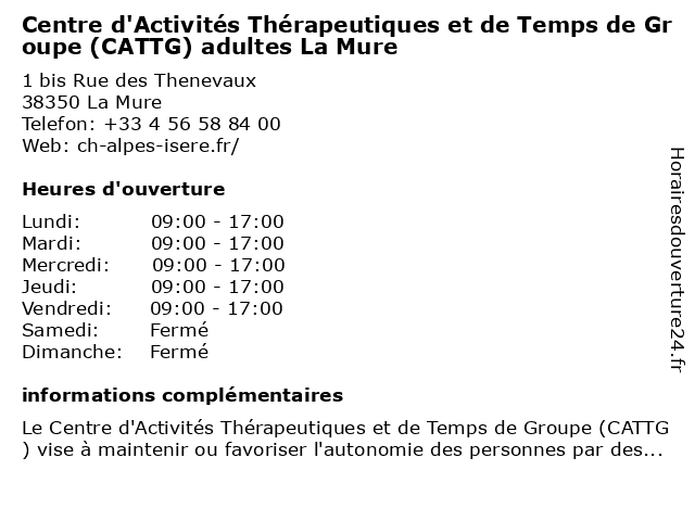Termes de recherche pour Centre d'Activités Thérapeutiques et de Temps de Groupe (CATTG) adultes La Mure:la, et, de, mure, centre, temps, groupe, adultes, d'activites, therapeutiques, cattg |