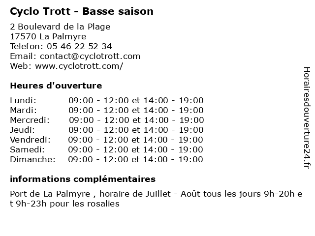 | Mercredi | 09:00-12:00 et 14:00-19:00 |