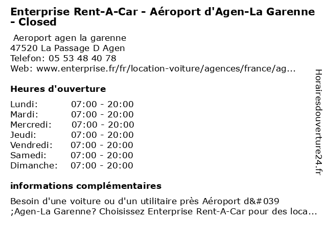 Termes de recherche pour Enterprise Rent-A-Car - Aéroport d'Agen-La Garenne - Closed:la, d'agen, garenne, car, rent, aéroport, enterprise, closed |