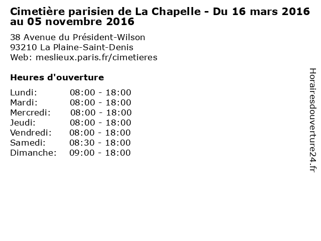 1 Cimetière parisien de La Chapelle - Du 06 novembre 2016 au 15 mars 2017 (Distance: 0,00 km) 38 Avenue du Président-Wilson, 93210 La Plaine-Saint-Denis 06, 15, 2016, 2017, arbre, au, chapelle, cimetière, de, du, espace vert, forêt, jardin, la, loisirs, mars, nature, novembre, parc, parisien 2 Cimetière parisien de Saint-Ouen - Du 16 mars 2016 au 05 novembre 2016 (Distance: 1,59 km) 69 Avenue Michelet, 93400 Saint-Ouen 05, 16, 2016, arbre, au, cimetière, de, du, espace vert, forêt, jardin, loisirs, mars, nature, novembre, ouen, parc, parisien, prairie, saint 3 Piscine Bertrand Dauvin / Du 20 février 2016 au 06 mars 2016 (Distance: 2,40 km) 12 rue René Binet, 75018 Paris 06, 20, 2016, au, bertrand, dauvin, du, equipement, février, joyeuse, l'heure, livre, mars, médiathèque, piscine, services 4 Cimetière parisien d'Ivry - Du 16 mars 2016 au 05 novembre 2016 (Distance: 3,14 km) 164 Avenue Jean-Jaurès, 93500 Pantin 05, 16, 2016, arbre, au, cimetière, d'ivry, du, espace vert, forêt, jardin, loisirs, mars, nature, novembre, parc, parisien, prairie, square 6 Cimetière de Saint-Vincent - Du 16 mars 2016 au 05 novembre 2016 (Distance: 3,52 km) 6 Rue Lucien-Gaulard, 75018 Paris 05, 16, 2016, arbre, au, cimetière, de, du, espace vert, forêt, jardin, loisirs, mars, nature, novembre, parc, prairie, saint, square, vincent |