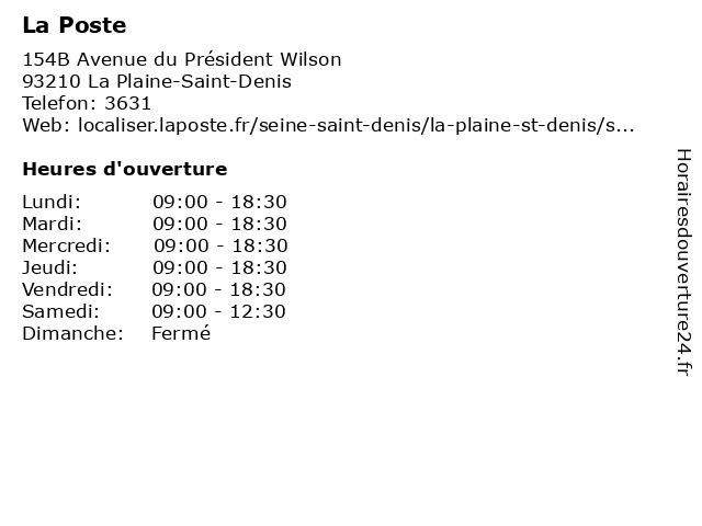 | 1 La Poste (Distance: 1,17 km) 95 Avenue Michelet, 93400 St Ouen electronic store, la, poste, services, store 2 La Poste (Distance: 1,76 km) 2 Docteur Bauer, 93400 St Ouen electronic store, la, poste, services, store 3 La Poste (Distance: 1,85 km) 13 Avenue Gabriel Peri, 93400 St Ouen electronic store, la, poste, services, store 4 La Poste (Distance: 2,77 km) 64 Avenue Edouard Vaillant, 93500 Pantin electronic store, la, poste, services, store 5 La Poste (Distance: 3,95 km) 3 Rue de Paris, 95600 Eaubonne colis, express chronopost, expédition, la, poste, réexpédition internationale, service, suivi du courrier 6 |