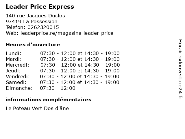 1 Leader Price Express (Distance: 11,00 km) 123 route de Saint-François, 97400 Saint-Denis dessert, discount, express, frais, leader, légume, price, salée, sucrée, supermarché, surgelés, vente, épicerie 2 Leader Price Express (Distance: 11,33 km) 7 rue Leconte De Lisle, 97460 Saint-Paul discount, express, fruits, leader, légume, price, supermarché, épicerie 3 Leader Price Express (Distance: 12,26 km) 43 Rue Tourette, 97400 Saint-Denis discount, express, fruits, leader, légume, price, supermarché, épicerie 4 Leader Price Express (Distance: 14,46 km) 34 chemin Des Longanis, 97490 Saint-Denis discount, express, fruits, leader, légume, price, supermarché, épicerie 5 Leader Price (Distance: 4,60 km) 57 Chemin Boutique Rouge, 97411 Saint-Paul dessert, discount, frais, leader, légume, price, salée, sucrée, supermarché, surgelés, vente, épicerie 6 Leader Price Sainte-Thérèse (Distance: 4,70 km) 28 rue Karl Marx, 97419 La Possession discount, fruits, leader, légume, price, sainte, supermarché, thérèse, épicerie |