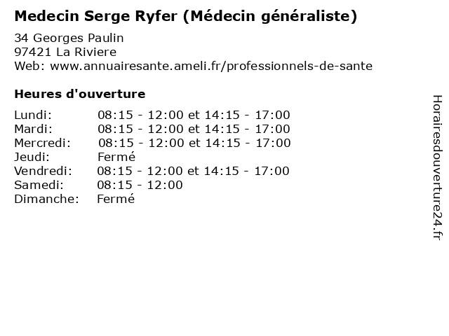 1 Dr Serge Ryfer - Médecin généraliste (Distance: 0,71 km) 34 Rue Georges Paulin, 97421 Saint-Louis consultation, docteur, dr, généraliste, med, médecin, ryfer, serge, traitement 2 Medecin Mireille Evrin (diabétologue) (Distance: 3,49 km) 135 Avenue Principale, 97450 Saint-Louis diabétologue, docteur, evrin, medecin, mireille, sante, services 3 Medecin Pascal Carli (Allergologue) (Distance: 3,74 km) 5 Bory St.-Vincent, 97410 Saint-Pierre allergologue, carli, docteur, medecin, pascal, sante, services 4 Medecin Djamel Bachagha (Angiologue) (Distance: 7,55 km) 69A Rue du Pere Favron, 97410 Saint-Pierre angiologue, bachagha, djamel, docteur, medecin, sante, services 5 Dr Serge Palmier - Médecin généraliste (Distance: 7,89 km) 84 Rue du Père Favron, 97410 Saint-Pierre consultation, docteur, dr, généraliste, med, médecin, palmier, serge, traitement 6 Medecin Dominique Caillet (Cardiologue) (Distance: 8,70 km) 46 Boulevard Hubert Delisle, 97410 Saint-Pierre caillet, cardiologue, docteur, dominique, medecin, sante, services |