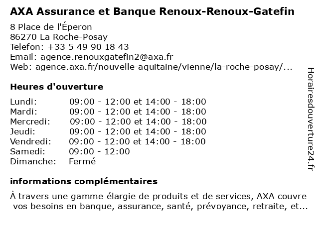 1 Caisse Primaire D'Assurance Maladie (Distance: 0,30 km) . Place de la République, 86270 La Roche-Posay administration, assoc, caisse, d'assurance, maladie, primaire, services, services publics 2 Axa Assurance (Distance: 11,42 km) 13 Place Du Champ, 09002 Foix assurance, assurance pret, assurances, axa, services 3 La Banque Postale (Distance: 11,55 km) 11 Rue De Tournon, 86260 Angles Sur L'Anglin banque, la, postale, services 4 AXA Gonnet Christophe Agent général (Distance: 17,53 km) 10 Rue de Verdun, 36220 Martizay agent, axa, christophe, gonnet, général 5 Assurance Thelem Agence Martizay (Distance: 17,70 km) 10 rue de la poste, 36220 Martizay agence, assurance, martizay, thelem 6 AXA Assurance et Banque Renoux-Renoux-Gatefin (Distance: 22,81 km) 48 Avenue de l'Europe, 86220 Dangé-Saint-Romain assurance, assurance appartement, assurance auto, assurance entreprise, assurance epargne, assurance habitation, assurance maison, assurance professionnelle, assurance santé, assurance voiture, axa, banque, et, gatefin, renoux |
