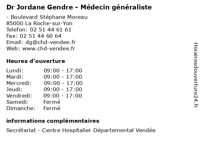 2 Boulangerie Pâtisserie Gendre (Distance: 23,23 km) 14 Place du 8 Mai 1945, 85150 Saint-Julien-des-Landes alimentation, baguette, boulangerie, commerce, gendre, gâteaux, pain, pâtisserie, saint-julien-des-landes 4 Dr Didier Gendre - Médecin généraliste (Distance: 58,10 km) 2 Rue de Bel air, 44710 Port-Saint-Père didier, docteur, dr, gendre, generaliste, généraliste, medical, médecin, soin 5 Dr Lea Casimont - Médecin généraliste (Distance: 0,00 km) - Boulevard Stéphane Moreau, 85000 La Roche-sur-Yon casimont, consultation, docteur, dr, généraliste, lea, med, médecin, traitement 6 Dr Eric Chiale - Médecin généraliste (Distance: 0,00 km) - Boulevard Stéphane Moreau, 85000 La Roche-sur-Yon chiale, consultation, docteur, dr, eric, généraliste, med, médecin, traitement |