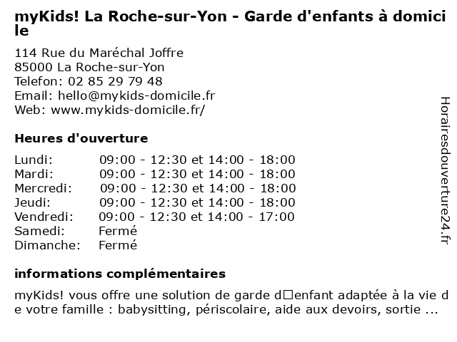 1 APEF La Roche-sur-Yon - Aide à domicile, Ménage et Garde d'enfants (Distance: 0,41 km) 3 Rue du Maréchal Lyautey, 85000 La Roche-sur-Yon aide, apef, d'enfants, domicile, et, garde, la, ménage, roche, sur, yon 2 Kangourou Kids | Agence de garde d'enfants (Distance: 0,51 km) 12 Rue Paul Doumer, 85000 La Roche-sur-Yon agence, babysitter, babysitting, d'enfants, de, garde, garde enfant, garde enfant a domicile, kangourou, kids, nounou, sortie ecole 3 Vitalliance La Roche-sur-Yon - Aide à domicile (Distance: 0,52 km) 6 Rue Stéphane Guillemé, 85000 La Roche-sur-Yon aide, aide à domicile, auxiliaire de vie, dame de compagnie, domicile, garde de nuit, garde malades, la, roche, sur, téléassistance, vitalliance, yon 4 MERCI+ Services à Domicile (Distance: 0,62 km) 160 route de Cholet,, 85000 La Roche-sur-Yon aide, domicile, merci+, personnes, services, âgées 5 APEF La Roche-sur-Yon - Aide à domicile, Ménage, Jardinage et Garde d'enfants (Distance: 1,29 km) 65 Boulevard le Corbusier, 85000 La Roche-sur-Yon aide, apef, d'enfants, domicile, et, garde, jardinage, la, ménage, roche, sur, yon 6 Domicile Clean (Distance: 2,03 km) 114 rue de Gutenberg, 85000 La Roche-sur-Yon agence, aides, clean, domicile, services |