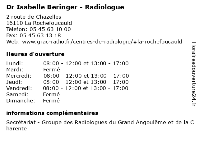 1 Dr Isabelle Beringer - Radiologue (Distance: 18,01 km) 10 chemin de Frégeneuil, 16800 Soyaux beringer, consultation, docteur, dr, isabelle, med, médecin, médecine, radiologue, traitement 2 Cartier Isabelle Helene (Distance: 12,69 km) Lieu Dit Le Poteau, 16380 Saint Germain De Montbron cartier, helene, isabelle, restaurants 3 Dr Isabelle Delplanque - Médecin du travail (Distance: 15,86 km) 83 Rue Simes, 16340 L'Isle-d'Espagnac consultation, delplanque, docteur, dr, du, isabelle, med, médecin, traitement, travail 5 Maître Isabelle Nadaud-Mesnard - Avocate (Distance: 19,66 km) 14 rue de Lavalette, 16000 Angouleme avocat, avocate, droit, isabelle, juridictionnelle, maître, mesnard, nadaud, négociation 6 Dr Isabelle Beringer - Radiologue (Distance: 20,81 km) 51 avenue du Président Wilson, 16000 Angoulême beringer, consultation, docteur, dr, isabelle, med, médecin, médecine, radiologue, traitement |