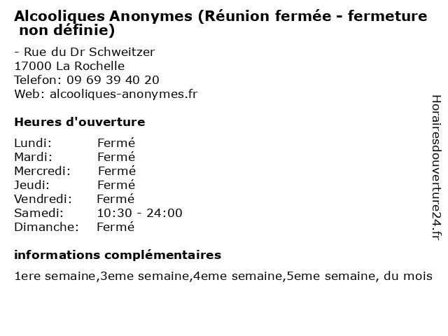 Termes de recherche pour Alcooliques Anonymes (Réunion fermée - fermeture non définie):reunion, non, fermeture, alcooliques, anonymes, définie, fermée |