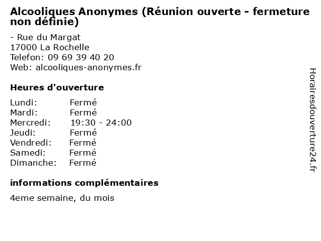 Termes de recherche pour Alcooliques Anonymes (Réunion ouverte - fermeture non définie):reunion, non, fermeture, ouverte, alcooliques, anonymes, définie |