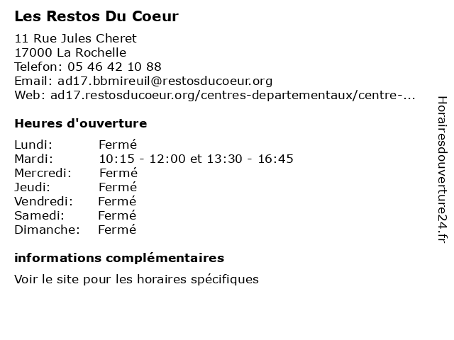 1 Les Restos Du Coeur (Distance: 15,20 km) 5 Rue du père ignace, 17410 Saint Martin de Ré aide, coeur, dons, du, les, restos, solidarité, vente 2 Les Restos Du Coeur La Rochelle Laleu (Distance: 1,82 km) 57 Rue de l'Amiral Duperré, 17000 La Rochelle aides, alimentaire, coeur, du, la, laleu, les, restos, rochelle, santé, solidarité, soutien 3 Les Restos Du Coeur La Rochelle Bongraine (Distance: 3,91 km) 7 Rue Jean-Baptiste Charcot, 17000 La Rochelle aides, alimentaire, bongraine, coeur, du, la, les, restos, rochelle, santé, solidarité, soutien 4 Les Restos Du Coeur La Rochelle Villeneuve (Distance: 4,80 km) 9 Rue Camille Desmoulins, 17000 La Rochelle aides, alimentaire, coeur, du, la, les, restos, rochelle, santé, solidarité, soutien, villeneuve 5 Coeur Campagne (Distance: 19,52 km) 29 Ter Place de la République, 17290 Aigrefeuille-d'Aunis campagne, coeur 6 KIDS AND CIE LA ROCHE SUR YON (Distance: 1,09 km) 21 Avenue Denfert-Rochereau, 17000 La Rochelle accompagnement, and, apprentissage, assistante maternelle, cie, crèche, développement de la personnalité, kids, la, micro crèche, roche, soutien, sur, yon |