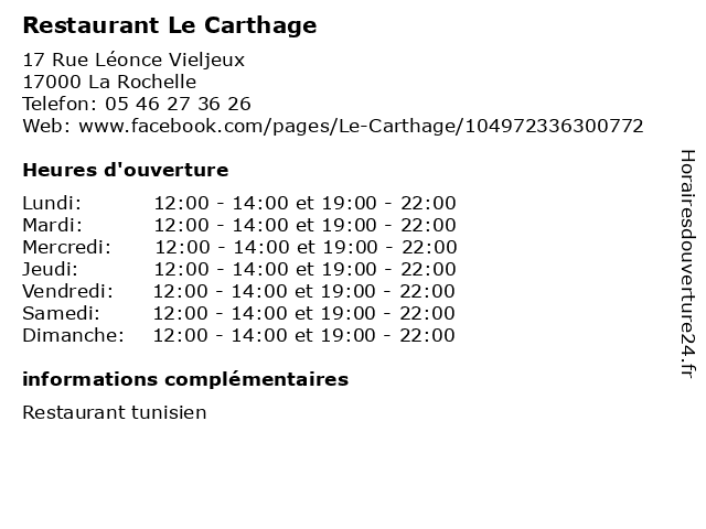 | Dimanche | 12:00-14:00 et 19:00-22:00 |