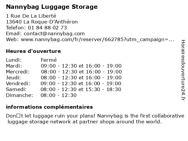 1 Nannybag Luggage Storage (Distance: 18,75 km) 641 Chem. Du Touret, 13300 Salon-De-Provence luggage, nannybag, storage 2 Luggage Storage Salon Railway Station - Radical Storage (Distance: 19,03 km) 2 Pl. du Général de Gaulle, 13100 Salon-de-Provence luggage, luggage storage, luggage storage near me, radical, railway, salon, station, storage 3 Nannybag Luggage Storage (Distance: 20,05 km) Cd 10 Route De Berre, 13510 Eguilles luggage, nannybag, storage 4 Nannybag Luggage Storage - CLOSED (Distance: 23,48 km) 45 Bd Aristide Briand, 13100 Aix-En-Provence closed, luggage, nannybag, storage 5 Nannybag Luggage Storage - CLOSED (Distance: 23,86 km) 8 Rue De La Couronne, 13100 Aix-En-Provence closed, luggage, nannybag, storage 6 |