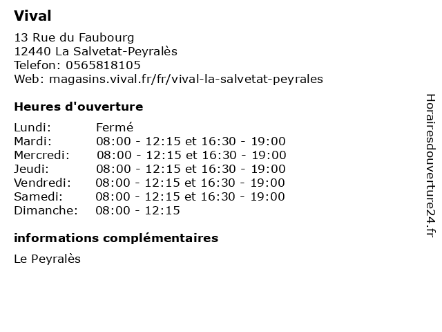 1 Vival (Distance: 11,24 km) 25 Avenue du Viaur,, 81190 Pampelonne alimentaire, discount, distributeur, distribution, fruits, grande, hypermarché, légumes, supermarché, vival, épicerie 3 Vival (Distance: 19,37 km) 33 Avenue Jean Jaurès,, 81400 Carmaux bread, deli, fish shop, gas bottles, photocopy, removing packages, vival, wine cellar 4 Vival By Casino (Distance: 9,16 km) 10 Place du Foirail, 81190 Mirandol-Bourgnounac alimentation, by, casino, distributeur alimentaire, supermarché, supérette, vival, épicerie 5 PIZZA VIVAL (Distance: 19,71 km) 11 Arcades du Consulat, 12200 Villefranche-de-Rouergue pizza, pizza à emporter, pizzeria, vival 6 Rural Master - Ségala Aliments (Distance: 18,99 km) - ZA de Marengo, 12160 Baraqueville aliments, animaleries, bricolage, droguerie, jardinage, master, motoculture, rural, ségala |
