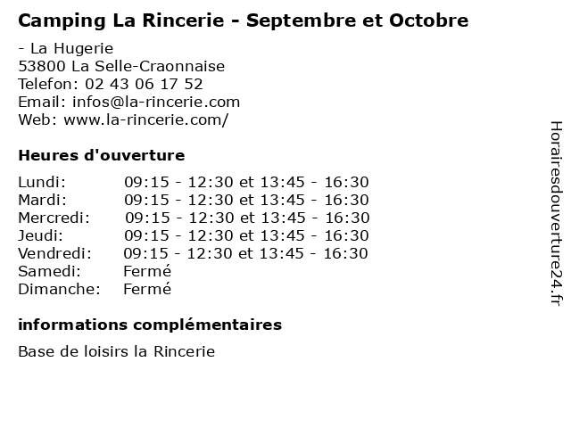 1 Camping La Rincerie - Mai et Juin (Distance: 0,00 km) - La Hugerie, 53800 La Selle-Craonnaise accueil, camping, caravaning, et, juin, la, loisirs, mai, mai/juin, rincerie, tourisme, vacances 2 Camping La Rincerie - Juillet et Août (Distance: 0,00 km) - La Hugerie, 53800 La Selle-Craonnaise accueil, août, camping, caravaning, et, juillet, juillet/août, la, loisirs, rincerie, tourisme, vacances 3 Camping La Rincerie - Mars et Avril (Distance: 0,00 km) - La Hugerie, 53800 La Selle Craonnaise accueil, avril, camping, caravaning, et, la, loisirs, mars, mars/, rincerie, tourisme, vacances 4 Cimetière communal - Octobre à Mars (Distance: 8,13 km) - Route de Rennes, 53400 Craon 1er, 31, au, caveau, cimetière, communal, du, défunts, funéraire, mars, municipal, octobre, service 5 Cimetière communal - Avril à Septembre (Distance: 8,13 km) - Route de Rennes, 53400 Craon 1er, 30, au, avril, caveau, cimetière, communal, du, défunts, funéraire, municipal, septembre, service 6 Déchèterie - Mars à Octobre (Distance: 14,92 km) - Rue de la Pidaie, 49420 Pouancé benne, débarras, déchets, déchèterie, détritus, mars, octobre |