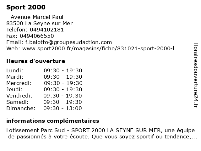 1 Menuiserie 2000 (Distance: 0,63 km) 31 Rue du Luxembourg, 83500 La Seyne-sur-Mer 2000, agencement, aluminium, aménagement, menuiserie, rénovation 2 Twenty Six Sport (Distance: 1,50 km) 20 Rue du Commerce, 83140 Six-Fours-les-Plages six, sport, twenty 3 Dr Philippe Boulard - Médecin du sport (Distance: 1,69 km) 212 Chemin des Delphinium, 83190 Ollioules boulard, consultation, docteur, dr, du, med, médecin, médecine, philippe, sport, traitement 4 Studio IDC - Sport & Danse (Distance: 2,77 km) 1 Avenue Laënnec, 83140 Six-Fours-les-Plages danse, idc, sport, studio 5 Optic 2000 (Distance: 3,36 km) 67 Rue de la République, 83140 Six-Fours-les-Plages 2000, lunettes, optic, santé, solaires 6 Sport Garage (Distance: 4,06 km) 1006 Chemin Saint Roch, 83110 Sanary sur Mer accessoires, automobile, carrosserie, garage, réparation, sport, vente, vidange |