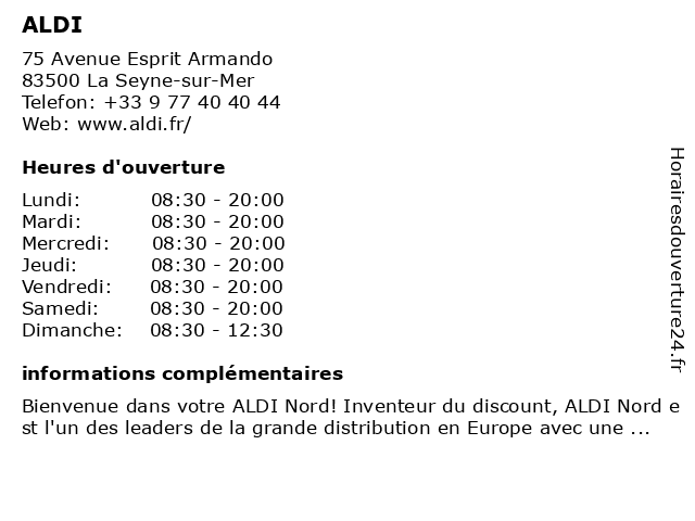 1 Aldi (Distance: 3,71 km) - Boulevard de l'Europe, 83500 La-Seyne-sur-Mer aldi, commerce de détail, de l'industrie, internationale, épicerie 2 ALDI (Distance: 3,80 km) Boulevard de l'Europe, 83500 La Seyne-sur-Mer aldi, aldi près de moi, courses près de moi, magasin, magasin discount, magasin discount près de moi, supermarché, supermarché près de moi, supermarchés, supermarchés près de moi, épicerie, épicerie près de chez moi 3 Aldi (Distance: 4,33 km) - Zac de la Rode, 83100 Toulon aldi, alimentaire, alimentation, courses, distributeur, hypermarché, leader, price, supermarché, supérette, épicerie 4 ALDI (Distance: 4,33 km) 16 Place Général Pouyade, 83041 Toulon aldi, aldi près de moi, courses près de moi, magasin, magasin discount, magasin discount près de moi, supermarché, supermarché près de moi, supermarchés, supermarchés près de moi, épicerie, épicerie près de chez moi 5 ALDI (Distance: 7,17 km) 166 Rue Henri Sainte-Claire Deville, 83100 Toulon aldi, aldi près de moi, courses près de moi, magasin, magasin discount, magasin discount près de moi, supermarché, supermarché près de moi, supermarchés, supermarchés près de moi, épicerie, épicerie près de chez moi 6 Aldi (Distance: 7,17 km) 166 Rue Sainte Claire Deville, 83100 Toulon aldi, alimentaire, alimentation, courses, discount, distributeur, fruits, légumes, supermarché, supérette, épicerie |
