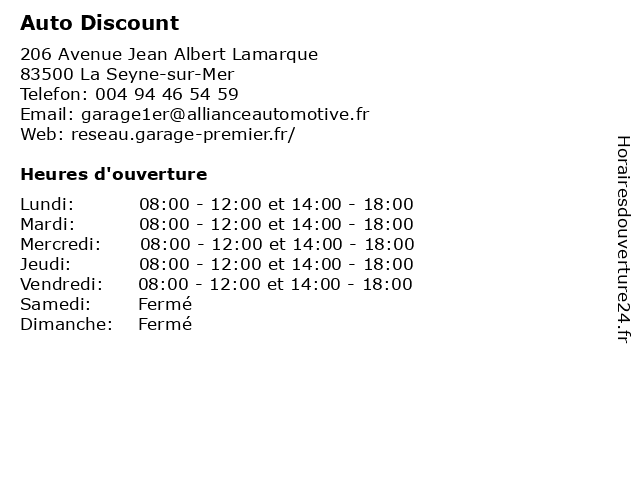 1 KLO - Discount Store (Distance: 11,65 km) 7 Avenue des Frères Lumière, 83160 La Valette-du-Var alimentation, braderie, destockeur, discount, hygiène, klo, la, store, valette 2 E.Leclerc Manège A Bijoux (Distance: 0,20 km) - Avenue Albert Lamarque, 83500 La Seyne Sur Mer bijoutier, bijoux, création de bijoux, e.leclerc, magasin de montres, manège, réparation de montres 4 Centre contrôle technique DEKRA (Distance: 0,29 km) Rue Paul Marcel, 83500 La Seyne-sur-Mer 4x4, camping car, centre, collection, contrôle, dekra, diesel, electrique, essence, gazole, suv, technique, utilitaire, voiture 5 Speedy (Distance: 0,30 km) Avenue Marcel Paul, 83500 La Seyne-sur-Mer accessoires et pièces automobiles, atelier de réparation automobile, magasin de pneus, magasin de vitrages automobiles, réparation automobile, service de climatisation automobile, speedy 6 MAAF Assurances LA SEYNE SUR MER (Distance: 0,33 km) Allée de Tallinn, 83500 La Seyne-sur-Mer assurance, assurance auto, assurance habitation, assurance moto, assurance professionnelle, assurance prêt immobilier, assurances, crédit auto, la, maaf, mer, mutuelle, mutuelle santé, seyne, sur |
