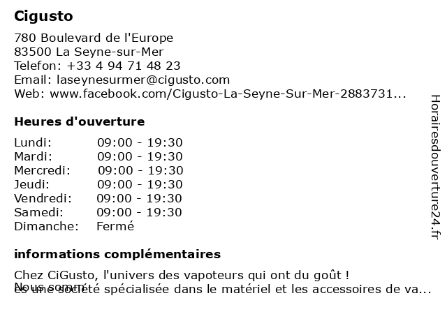 1 Cigusto Marseille La Valentine (Distance: 36,95 km) Route de la Sablière, 13011 Marseille cigusto, la, marseille, valentine 3 NICOTECH BY CIGUSTO AIX-EN-PROVENCE (Distance: 57,50 km) Rue Raynaud de Piolenc, 13290 Aix-en-Provence aix, by, cigusto, en, nicotech, provence |