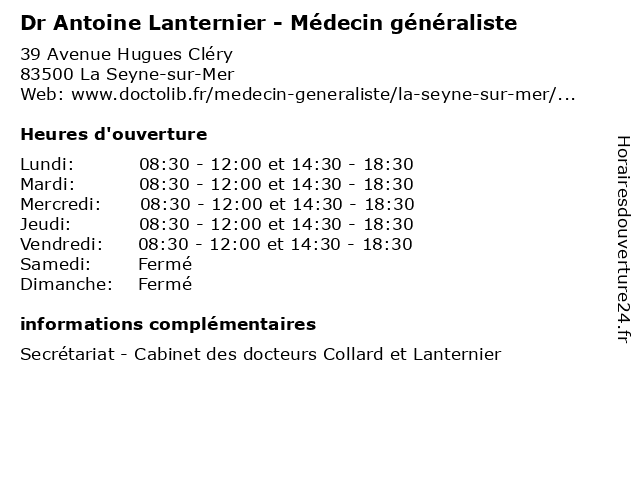 | Lundi | 08:30-12:00 et 14:30-18:30 |