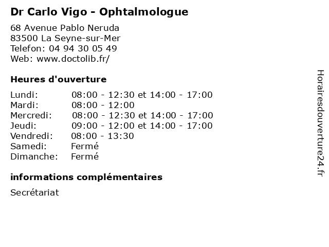 | Mercredi | 08:00-12:30 et 14:00-17:00 |