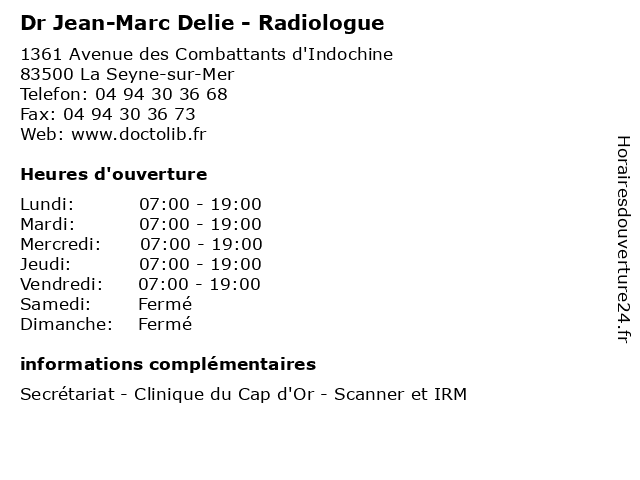 1 Dr Jean-Marc Delie - Radiologue (Distance: 2,59 km) 332 Avenue Frédéric Mistral, 83190 Ollioules consultation, delie, docteur, dr, jean, marc, med, médecin, médecine, radiologue, traitement 2 Dr Jean-Marc Delie - Radiologue (Distance: 7,74 km) - Avenue d'Orient, 83100 Toulon consultation, delie, docteur, dr, jean, marc, med, médecin, radiologue, traitement 3 Medecin Marc Perraud (Chirurgien général) (Distance: 0,02 km) 1361 Avenue des Anciens-Combattants, 83500 La Seyne-sur-Mer chirurgien, docteur, général, marc, medecin, perraud, sante, services 4 Dr. Marc Ktorza - Médecine générale (Consultation libre) (Distance: 2,83 km) 130 avenue de la calade, 83140 Six fours consultation, docteur, dr., générale, ktorza, libre, marc, médecine, santé 5 Dr. Marc Ktorza - Médecine générale (Consultation sur rendez-vous) (Distance: 2,83 km) 130 avenue de la calade, 83140 Six fours consultation, docteur, dr., générale, ktorza, marc, médecine, rendez, santé, sur, vous 6 Marc Orian (Distance: 5,67 km) . Toulon Ouest, 83190 Ollioules cafe, chaussures, enfants, homme, lingerie, marc, mode femme, orian, restaurant |