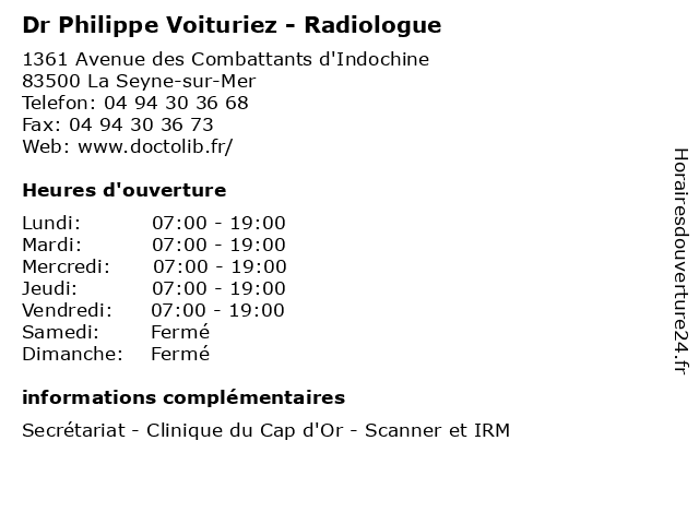 1 Dr Philippe Voituriez - Radiologue (Distance: 2,59 km) 332 Avenue Frédéric Mistral, 83190 Ollioules consultation, docteur, dr, med, médecin, médecine, philippe, radiologue, traitement, voituriez 2 Dr Philippe Meens - Radiologue (Distance: 0,00 km) 1361 Avenue des Combattants d'Indochine, 83500 La Seyne-sur-Mer cap, centre, clinique, d'imagerie, d'or, diagnostique, dr, du, et, imagerie, irm, meens, médicale, philippe, radiologie, radiologue, scanner, thérapeutique 3 Dr Philippe Commeau - Radiologue (Distance: 0,02 km) 1361 Avenue des combattants d'Indochine, 83500 La Seyne-sur-Mer commeau, consultation, docteur, dr, med, médecin, philippe, radiologue, traitement 4 Dr Philippe Habib - Psychiatre (Distance: 0,87 km) 523 Avenue de Rome, 83500 La Seyne-sur-Mer dr, folie, habib, philippe, psychiatre, psychiatrie, psychiatrique 5 Philippe Camps - Cabinet d'Avocats (Distance: 0,87 km) 505 Avenue de Rome, 83500 La Seyne sur Mer affaires, avocat, cabinet, camps, d'avocats, de, des, droit, du, famille, intervention, la, philippe, pénal, travail 6 Dr.Philippe Greillier - Médecin Pneumologue (Distance: 2,55 km) - av frederic mistral, 83190 Ollioules consultation, docteur, dr.philippe, greillier, médecin, pneumologue, santé |