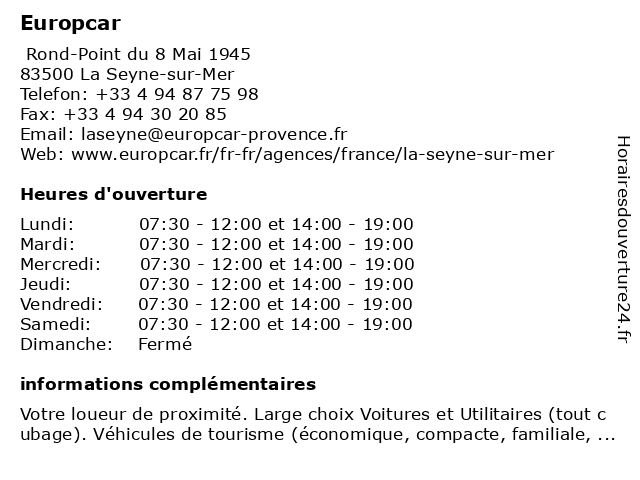 3 Europcar Centre Ville (Distance: 5,28 km) 322 avenue edouard le bellegou, 83000 Toulon agence, cartons, centre, déménagements, europcar, location, utilitaires, ville, véhicules 5 Europcar Brignoles (Distance: 36,07 km) Rn 7 quartier cante perdrix, 83170 Brignoles brignoles, europcar 6 Europcar (Distance: 36,26 km) n/a cante perdrix, 83170 Brignoles europcar, location de voitures, location de voitures de luxe, location de véhicules utilitaires, véhicules |