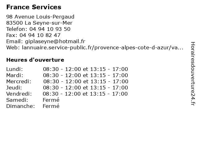 1 France Services (Distance: 9,19 km) 1620 Vieux Chemin de Sainte Musse, 83100 Toulon administration, communes, france, service, services, services publics 2 France Services (Distance: 10,95 km) 80 Chemin du Rouve, 83330 Le Beausset administration, communes, france, service, services, services publics 3 Caisse d'Allocations Familiales (CAF) (Distance: 0,01 km) 98 Avenue Louis-Pergaud, 83500 La Seyne-sur-Mer administration, assoc, caf, caisse, d'allocations, familiales, services, services publics 4 Caisse Primaire D'Assurance Maladie (Distance: 0,04 km) . Avenue Gérard-Philipe, 83500 La Seyne-sur-Mer administration, assoc, caisse, d'assurance, maladie, primaire, services, services publics 5 Pompes Funèbres De France - La seyne sur mer (Distance: 0,68 km) 27 Boulevard de Stalingrad, 83500 La Seyne-sur-Mer de, france, funèbres, la, mer, pompes, seyne, sur 6 |