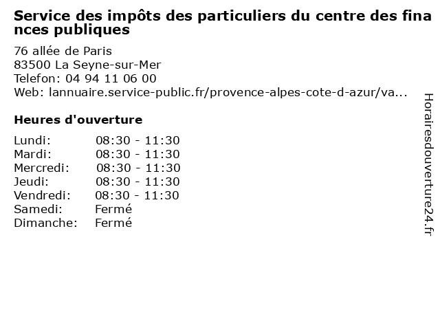 1 Service des impôts des particuliers du centre des finances publiques (Distance: 2,10 km) 2 Rue Charles-Gide, 83506 La Seyne-sur-Mer administration, centre, coeur, communauté, communes, des, du, finances, impôts, particuliers, publiques, service, services publics 2 Service des impôts des particuliers du centre des finances publiques (Distance: 7,12 km) 20 place Noël Blache, 83000 Toulon administration, centre, coeur, communauté, communes, des, du, finances, impôts, particuliers, publiques, service, services publics 3 SMC - Société Marseillaise de Crédit (Particuliers) (Distance: 1,21 km) 7 Rue Racine, 83140 Six-Fours les Plages agence, bancaire, crédit, de, marseillaise, particuliers, smc, société 4 Green Acres - Hermes Finances (Distance: 2,16 km) 162 av Joseph Raynaud, 83140 Six Fours Les Plages acres, agency, agent, apartment, finances, green, hermes, home, real estate 5 Service des impôts des particuliers du centre des finances publiques de Toulon Sud-Est (Distance: 7,14 km) 20 place Noël-Blache, 83081 Toulon administration, centre, coeur, communauté, communes, de, des, du, est, finances, impôts, particuliers, publiques, service, services publics, sud, toulon 6 Service des impôts des particuliers du centre des finances publiques de Toulon Sud-Ouest (Distance: 7,14 km) 20 place Noël-Blache, 83081 Toulon administration, centre, coeur, communauté, communes, de, des, du, finances, impôts, ouest, particuliers, publiques, service, services publics, sud, toulon |