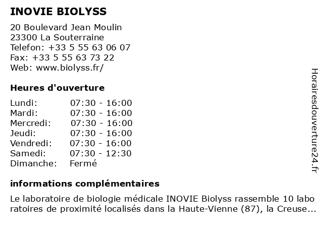 3 Biolyss (Distance: 35,68 km) 15 Avenue de la Libération, 87300 Bellac biolyss, bureau, consultation, dr, maladie, med, médecin, médecine, pratique, thérapie, traitement 6 |