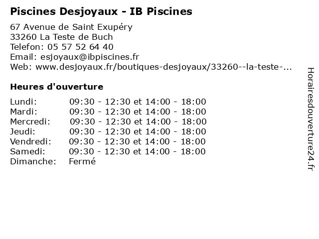 1 Piscines Desjoyaux - IB Piscines (Distance: 15,44 km) 13 Boulevard des Dunes Vertes, 33740 Ares analyse, construction, desjoyaux, entretien, ib, liner, piscines, produits piscines, rénovation 2 Alliance Piscines (Distance: 1,89 km) 16 Avenue Gustave Eiffel, 33260 La Teste-de-Buch alliance, piscines 3 Cash Piscines (Distance: 2,44 km) 725 Avenue du Parc des Expositions, 33260 La Teste-de-Buch accessoires, cash, entretien, piscine, piscines, service, spas 4 Piscines de France (Distance: 8,78 km) 2 rue des Cormorans, 33950 Lège Cap Ferret accessoires, constructeur, de, france, piscine, piscines, traitement 5 Piscines du Val de L'Eyre (Distance: 13,80 km) 13 Rue Carrérot, 33380 Biganos de, du, l'eyre, piscines, val 6 Cash Piscines (Distance: 14,89 km) 172 Rue Joseph-marie Jacquard, 33380 Biganos accessoires, cash, entretien, piscine, piscines, service, spas |
