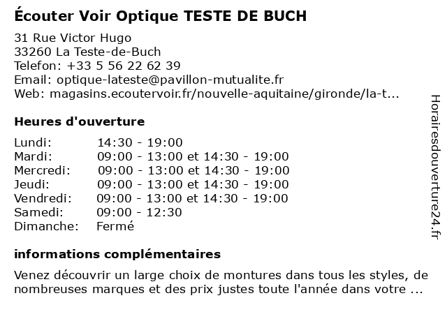 1 Écouter Voir Audition LA TESTE DE BUCH (Distance: 0,00 km) 31 Rue Victor Hugo, 33260 La Teste-de-Buch audition, buch, de, la, teste, voir, écouter 2 Optique Marianne (Distance: 0,40 km) 10bis rue Victor Hugo, 33260 La Teste-de-Buch correction, entretien, lentilles, lunettes, marianne, opticien, optique, solaire, vue 3 Optique Lafayette (Distance: 0,57 km) 11 rue du Captalat, 33260 La Teste-de-Buch correction, entretien, lafayette, lentilles, lunettes, opticien, optique, solaire, vue 4 Corfias Optique (Distance: 3,05 km) 21 avenue Maréchal de Lattre de Tassigny, 33470 Gujan Mestras corfias, lentilles, lunettes, opticien, optique, solaire, vues 5 Optique de la Plage (Distance: 3,66 km) 234 Boulevard de la Plage, 33120 Arcachon accessoires, de, la, lunettes, magasin, opticien, optique, plage 6 Optique du Pyla (Distance: 4,03 km) 59 Boulevard de l'Océan, 33115 Pyla-sur-Mer du, lentilles, lunettes, opticien, optique, pyla, solaires, vue |