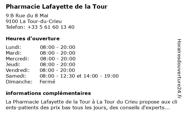 | Samedi | 08:00-12:30 et 14:00-19:00 |