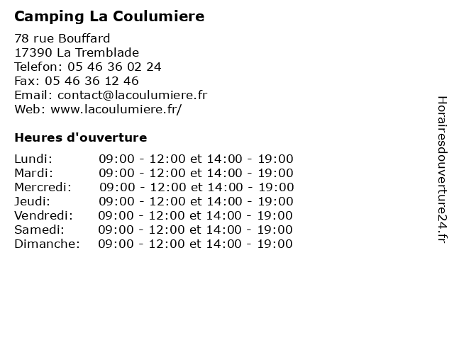| Mercredi | 09:00-12:00 et 14:00-19:00 |