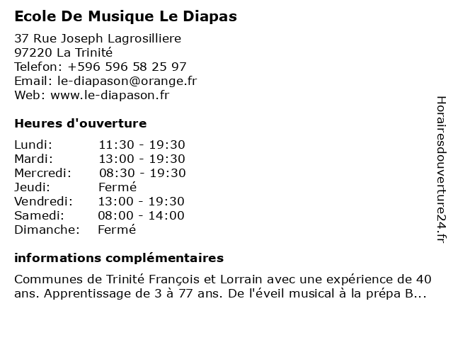 1 Ecole de Musique Le Diapason (Distance: 14,33 km) 17 Rue Isidore Pierre Louis, 97214 Le Lorrain de, diapason, ecole, le, musique 2 Ecole de Musique Le Diapason (Distance: 15,62 km) 4 rue Joseph Lagrosilliere, 97240 François (le) de, diapason, ecole, le, musique 3 École élémentaire publique Sainte Marie Sicche (Distance: 5,44 km) . Rue de Ville, 20190 Sainte Marie Sicche ecole, education, marie, publique, sainte, services, sicche, école, élémentaire 4 Ecole Maternelle Publique-Gros-Morne (Distance: 8,61 km) . Bois Lezard, 97213 Gros-Morne cours, ecole, gros, maternelle, morne, publique, services 5 Ecole Primaire Publique Victor Jean-Michel (Distance: 11,64 km) . Chapelle Villarson, 97231 Le Robert cours, ecole, education, jean, michel, primaire, publique, services, victor, école 6 Ecole Elementaire Publique-Le Lamentin (Distance: 12,20 km) . Roches Carrees, 97232 Le Lamentin cours, ecole, elementaire, lamentin, le, publique, services |
