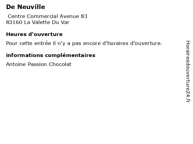2 Chocolat De Neuville (Distance: 0,09 km) 300 Avenue de l´Université, 83160 La Valette-du-Var chocolat, chocolaterie, confiserie, de, deneuville, neuville 3 Chocolat De Neuville (Distance: 10,28 km) 24 Rue Massillon, 83400 Hyeres bonbons, boutique, chocolat, confiseries, de, neuville 4 Fauchon (Distance: 3,42 km) 157 Maréchal Leclerc, 83000 Toulon chocolat et confiserie, fauchon, macarons, pâtisserie, thé, traiteurs 5 Leonidas (Distance: 6,01 km) 4 rue Berthelot, 83000 TOULON chocolat, confiserie, glaces, leonidas, pralines 6 Leonidas (Distance: 7,84 km) 181 Avenue du XVe Corps, 83200 Toulon chocolat, confiserie, leonidas, pralines |