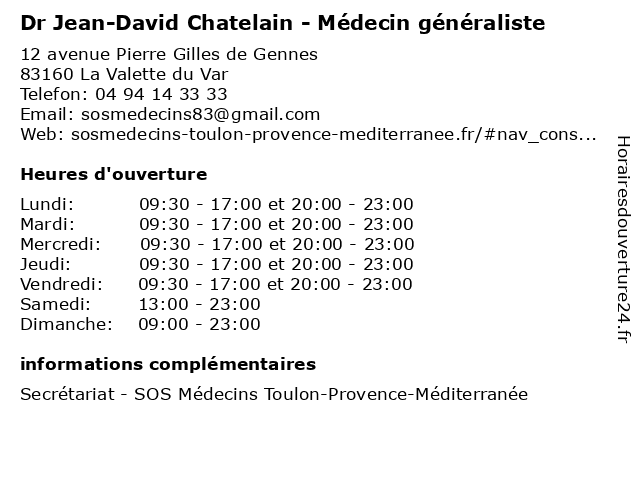 1 Dr. David Guedj - Médecin généraliste (Distance: 0,00 km) 12 avenue Pierre Gilles de Gennes, 83160 La Valette du Var consultation, david, docteur, dr., guedj, généraliste, med, médecin, traitement 2 Dr David Zbili - Médecin généraliste (Distance: 0,00 km) 12 avenue Pierre Gilles de Gennes, 83160 La Valette du Var consultation, david, docteur, dr, généraliste, med, médecin, traitement, zbili 3 Chelotti David Jacques (Distance: 2,85 km) Pizza Chelotti Bat a2 641 Rue Henri Ste Claire Devill, 83100 Toulon chelotti, david, jacques, restaurants 4 Mulatero David Paul (Distance: 3,37 km) Crustafrais Toulon Mulatero Arts Pei, 83100 Toulon david, mulatero, paul, restaurants 5 Jean Louis David (Distance: 3,41 km) 98 RN, 83160 La Valette du Var boutique, coiffeur, david, femmes, hommes, jean, louis, mode, shopping, shopping center 6 Jean-Louis David (Distance: 3,41 km) - RN 98, 83160 La Valette-du-Var coiffeur, david, jean, louis, mixte |