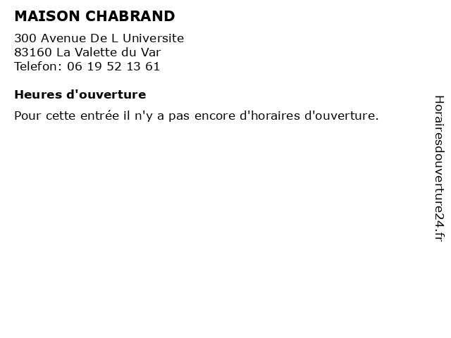 1 Chabrand (Distance: 0,36 km) 300 Avenue de l´Université, 83160 La Valette-du-Var 83, avenue, centre, chabrand, commercial, du, la, valette, var 2 Chabrand (Distance: 19,99 km) 39 Quai Charles de Gaulle, 83150 Bandol accessoires, boutique, chabrand, marroquinerie 3 House of Samsonite (Distance: 6,14 km) 44 Rue d'Alger, 83000 Toulon accessoires, boutique, chabrand, house, marroquinerie, of, samsonite 4 Chabrand (Distance: 20,29 km) 18 Rue De La Republique, 83150 Bandol accessoires, boutique, chabrand, marroquinerie 5 Chabrand (Distance: 55,20 km) 9 Quai Du Lazaret Cial Les Terrasses Du Port, 13002 Marseille 2ème chabrand 6 Maison Chabrand (Distance: 57,52 km) 11 11 Avenue De St Antoine, 13015 Marseille 15ème chabrand, maison |