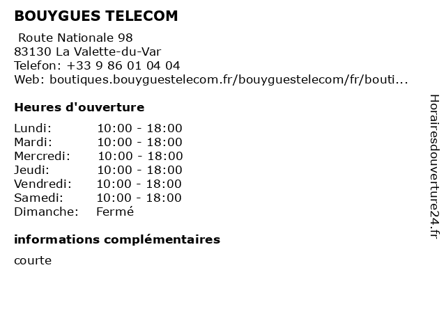 1 BOUYGUES TELECOM (Distance: 0,10 km) Centre Grand Var, 83130 La Valette-du-Var bouygues, fai, fournisseur d'accès internet, telecom, téléphonie mobile 2 BOUYGUES TELECOM (Distance: 6,83 km) Rue du Mûrier, 83000 Toulon bouygues, fai, fournisseur d'accès internet, telecom, téléphonie mobile 3 Bouygues Telecom (Distance: 6,95 km) 14 Pl. Pierre Puget,, 83000 Toulon accessories, bouygues, connections, gadgets, internet, mobile, phones, telecom, téléphonie 4 BOUYGUES TELECOM (Distance: 7,01 km) 34 Boulevard de Strasbourg, 83000 Toulon bouygues, fai, fournisseur d'accès internet, telecom, téléphonie mobile 5 BOUYGUES TELECOM (Distance: 9,51 km) 4 Avenue Gambetta, 83400 Hyères bouygues, fai, fournisseur d'accès internet, telecom, téléphonie mobile 6 BOUYGUES TELECOM (Distance: 11,36 km) Chemin de la Bouyère, 83190 Ollioules bouygues, fai, fournisseur d'accès internet, telecom, téléphonie mobile |